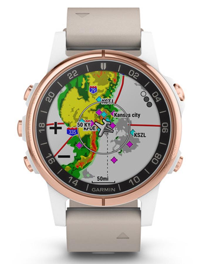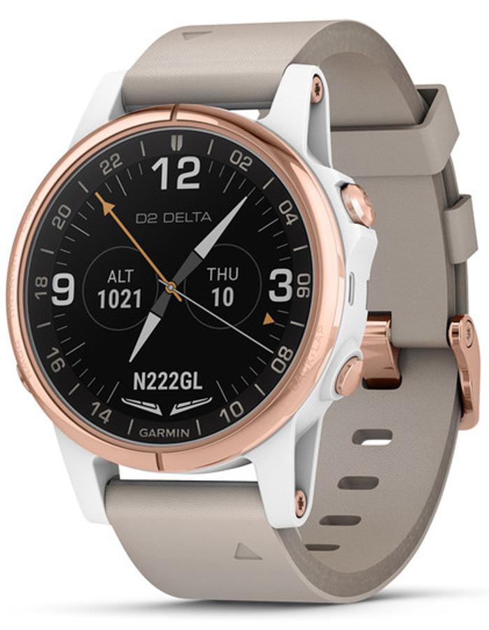 Get all the robust features of Garmin's D2 aviator series in a compact size with this 42mm D2 Delta model in rose gold-tone. Featuring a beige leather strap, wrist based heart rate monitor, dynamic color mapping, NEXRAD weather, automatic flight logging and alerts for course deviations, pattern altitudes and more. Smart notifications will keep you in touch while on the go while sport watch functions will keep your fitness on track. Includes additional white silicone strap.