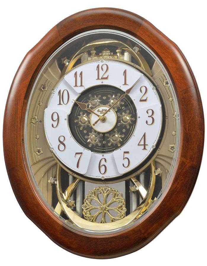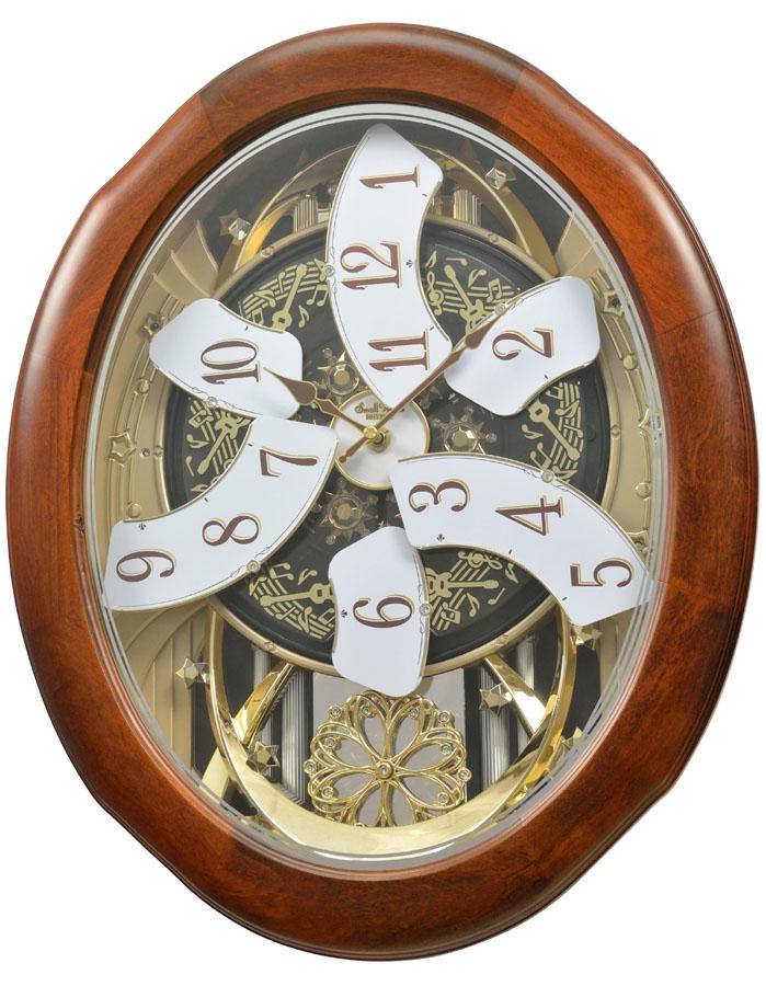 Crafted from walnut finished in medium pecan stain, this beautiful motion wall clock is truly Magnificent. Adorned with 37 Swarovski crystals on the dial and rotating pendulum, on the hour the clock's dial splits and reveals a scene of musical notes and instruments hidden underneath. Choose from 3 different playlists of 30 different melodies.