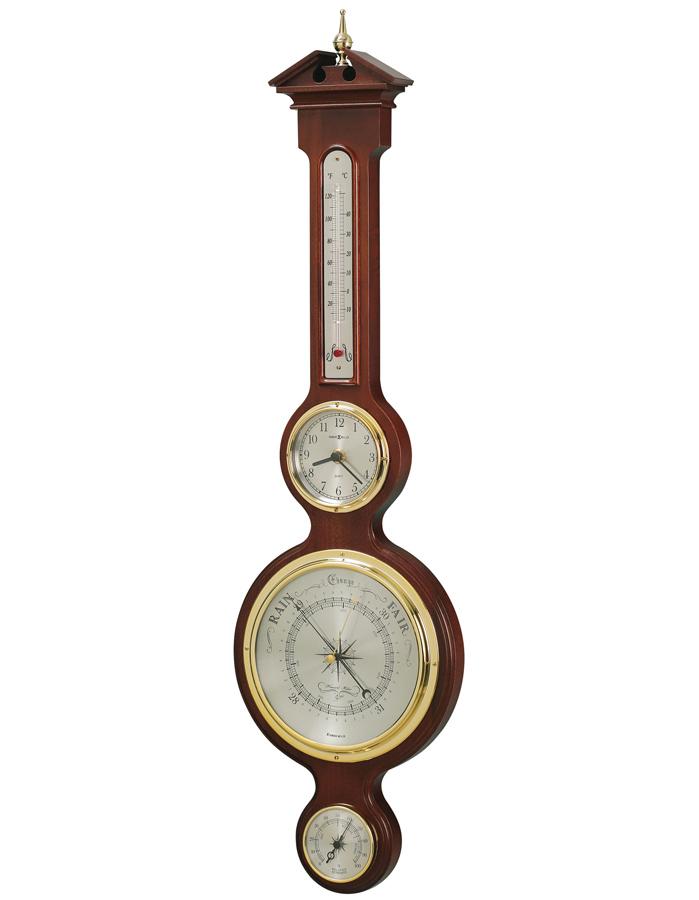 - A thermometer, clock, barometer, and hygrometer are encased in a handsome hardwood frame.