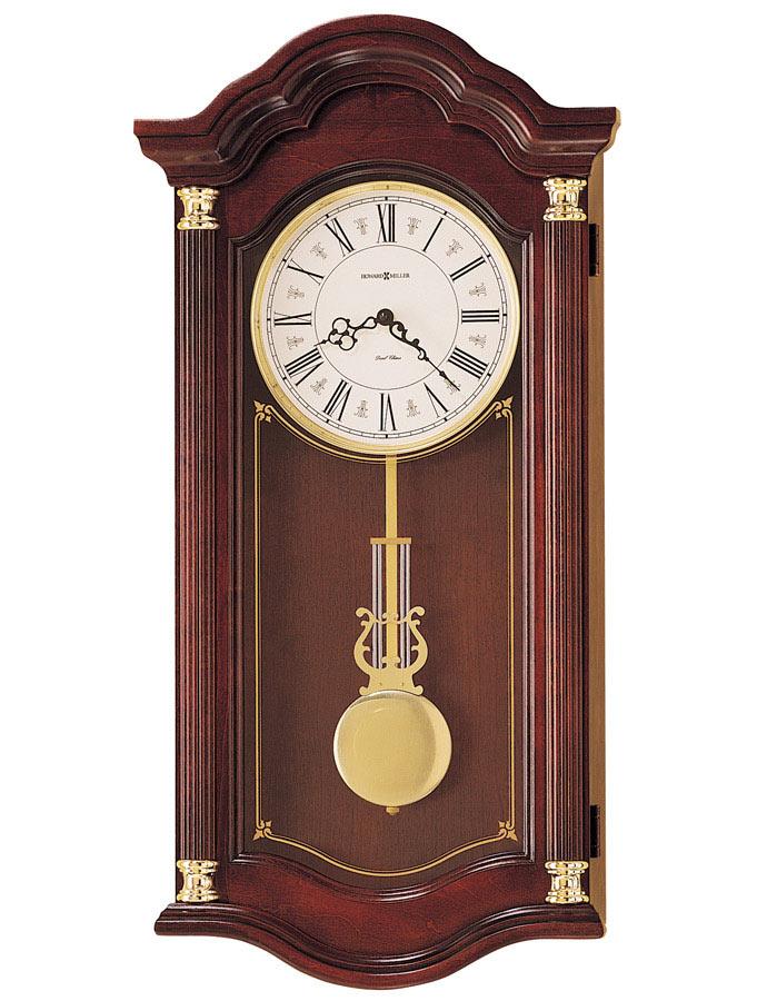 With many features, such as an arched bonnet, reeded columns along the side, gold-tone accents, and a warm Windsor Cherry finish, this handsome pendulum wall clock is a perfect fit for any traditional home decor.