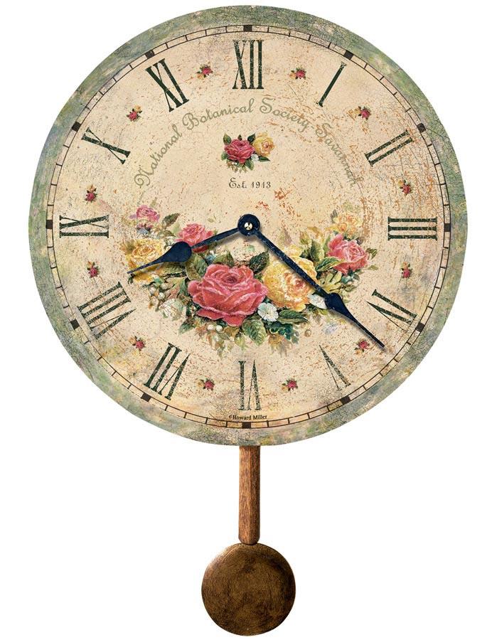 Offering a refreshing floral design, this unique wall clock is sure to brighten up any room it is placed in with a splash of color on the dial and an antiqued pendulum.