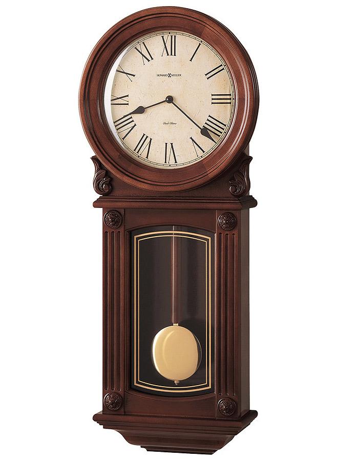 - A gold-tone design detailing on the lower glass draws attention to the wood and brass-finished pendulum, which glistens against a back panel finished to match the case.