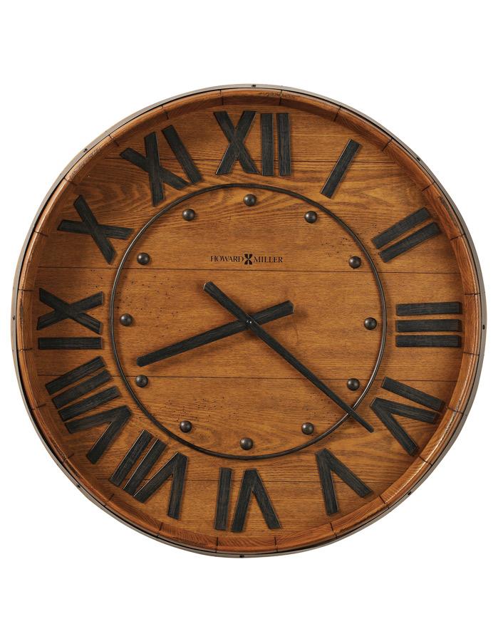 - This 25 inch gallery wall clock features Heirloom Oak finish and an applied metal band to resemble an authentic oak wine barrel.