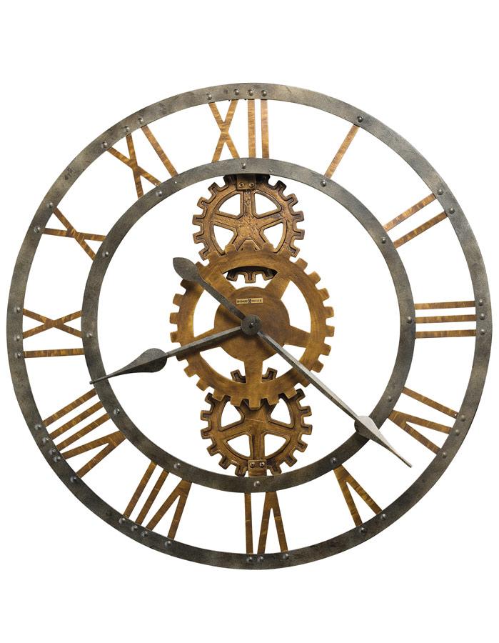 - The inner and outer rings and spade hands are finished in a warm gray iron. Features antique brass-finished gears and numerals.