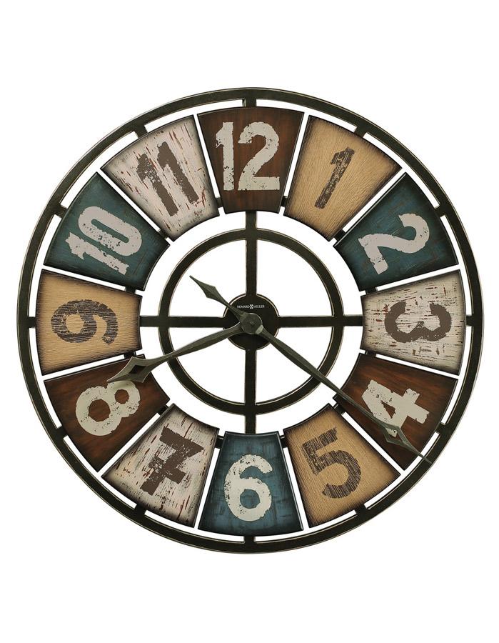 - This oversized wrought iron wall clock is finished in charcoal gray with silver edging and features applied multi-colored, highly-distressed wood panels with white and brown Arabic numerals.