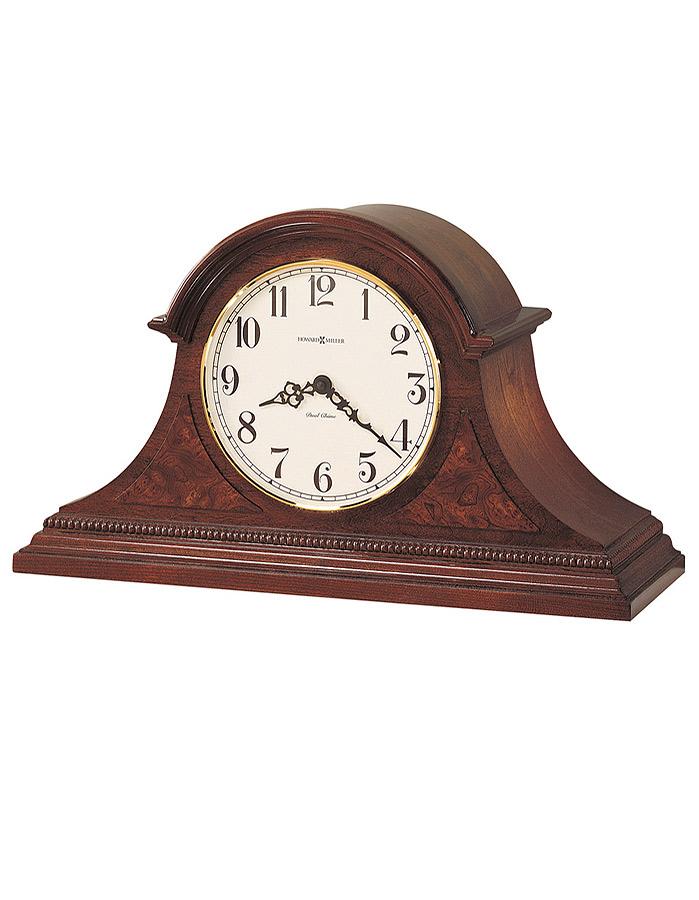 This classic chiming mantel clock has a crown top with off white dial and brass accents. There is a Windsor Cherry finish on the hardwood case with burlwood accents.