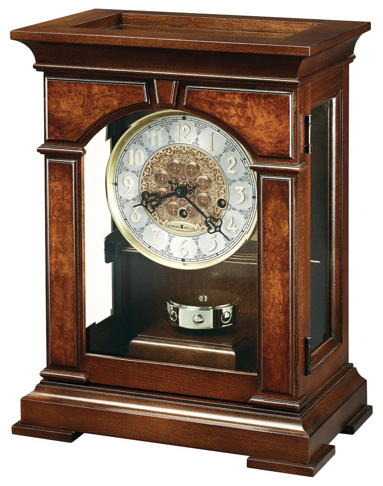Hand crafted in the USA, this stately mantel clock features an ornate dial and brass finished rotating pendulum. It is finished in a rich Cherry Bordeaux with beautiful burl wood accents. The front door opens for easy access to the dial and movement to keep it wound and running. The high precision German made key-wind movement will never require a battery or electricity to operate.