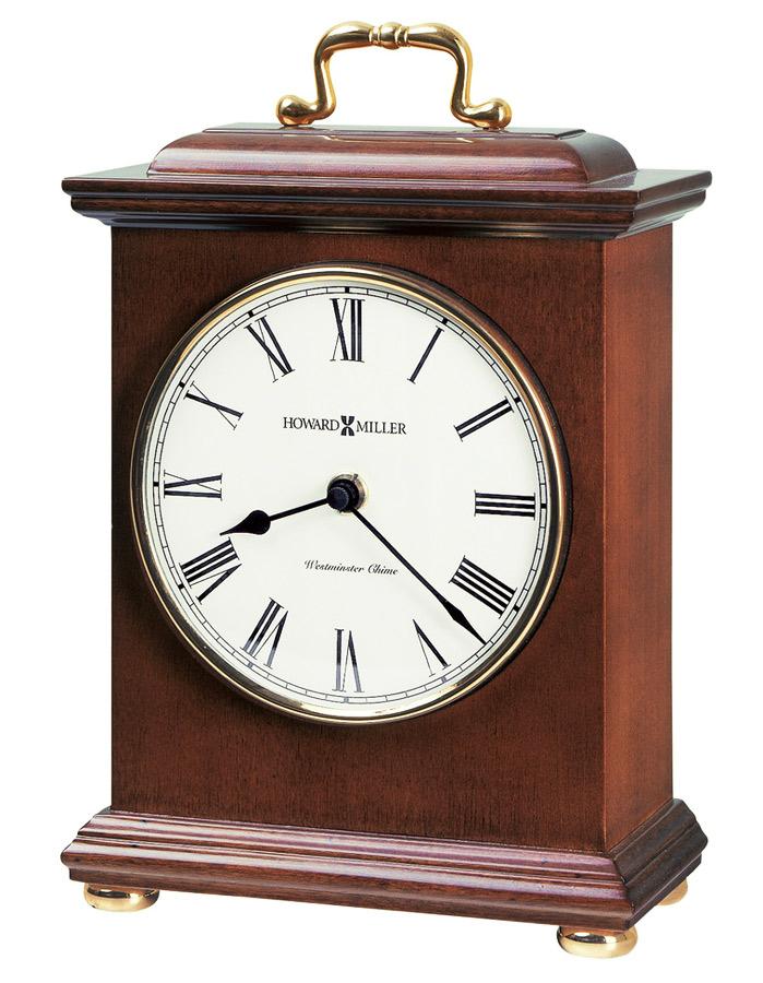 A perfect addition for your home, this lovely clock features a decorative brass finished handle, clock bezel, and feet in a warm Windsor Cherry finish.