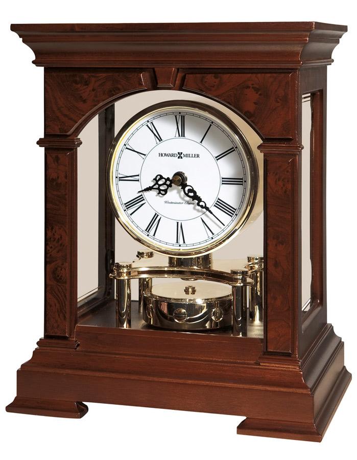 Showcasing a revolving brass-finished pendulum that sits below the clean white dial, this Howard Miller mantel clock can dress up any room.