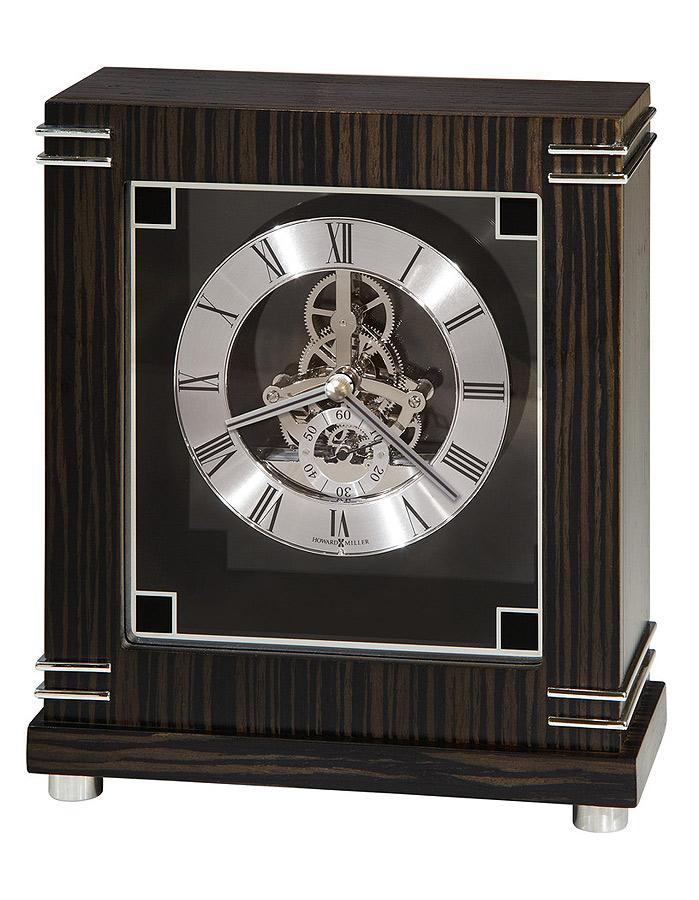 - Handsome Macassar ebony finished mantel clock with bold polished silver finished accents and round satin silver-tone feet.