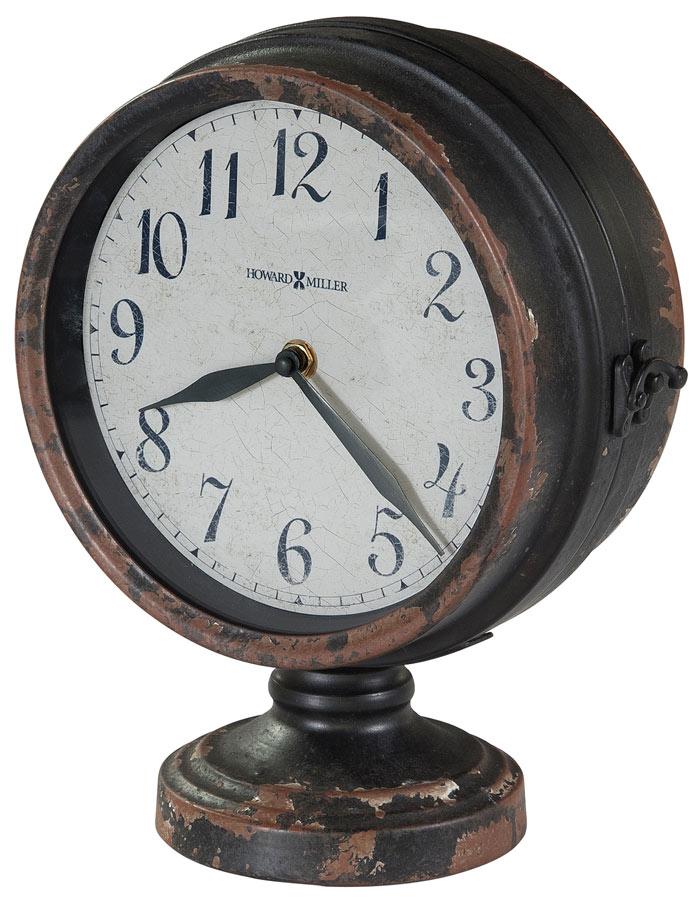Unique and eye-catching, this Cramden mantel clock features an antiqued black finish with two faces, one on each opposite side, each with an aged appearance but able to be set for different times.