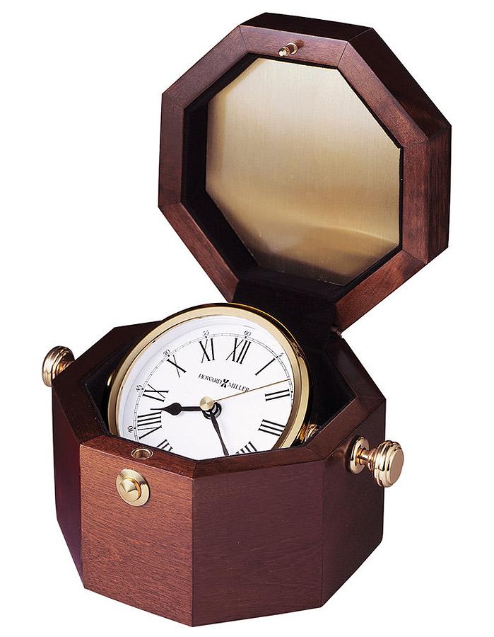 - A polished brass-finished gimbaled captain’s clock is housed in a felt lined octagonal chest.