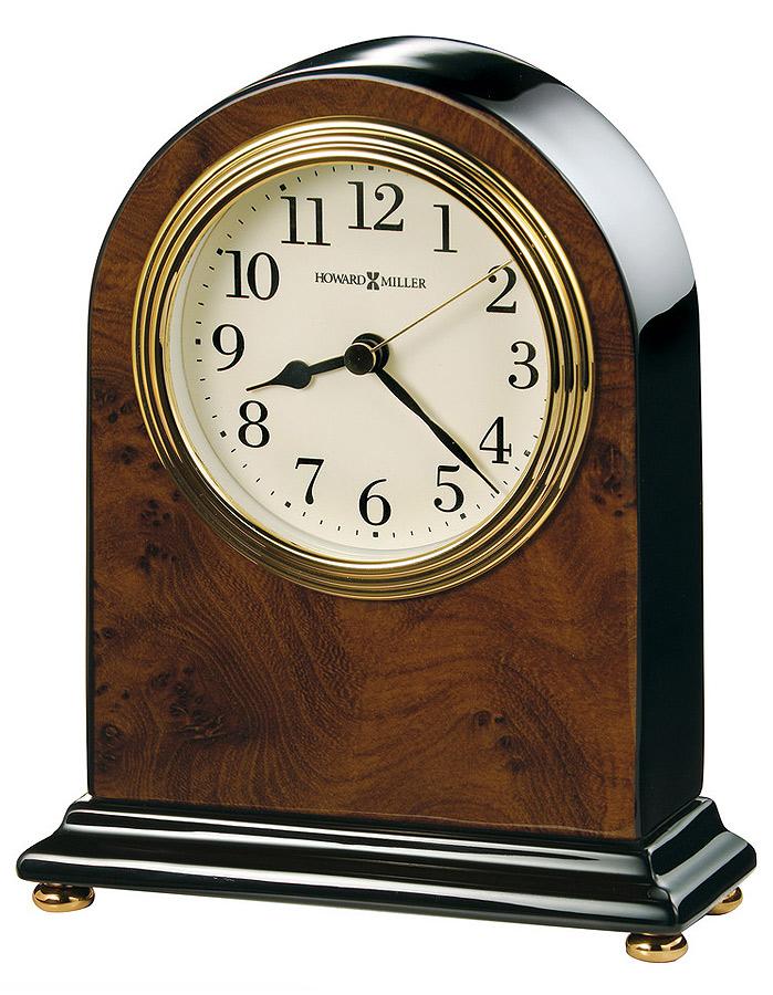 - An attractive high-gloss walnut piano finish on a hardwood arch table clock featuring a wood burl pattern on the front and back, with black sides and base. Polished brass button feet.