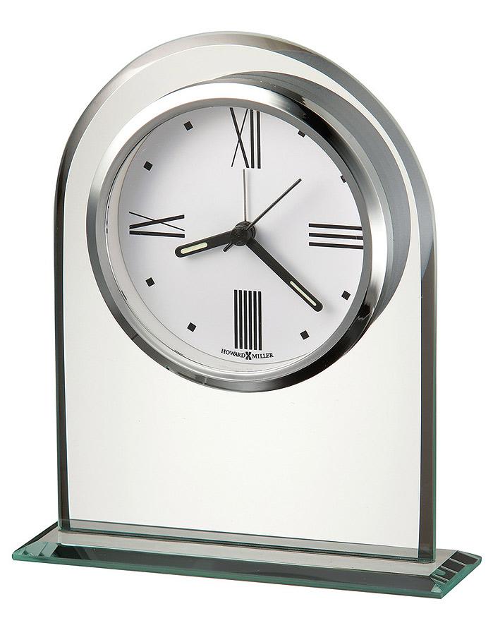 - The crisp white dial of this alarm clock is suspended within a beveled glass arch mounted on a glass base.