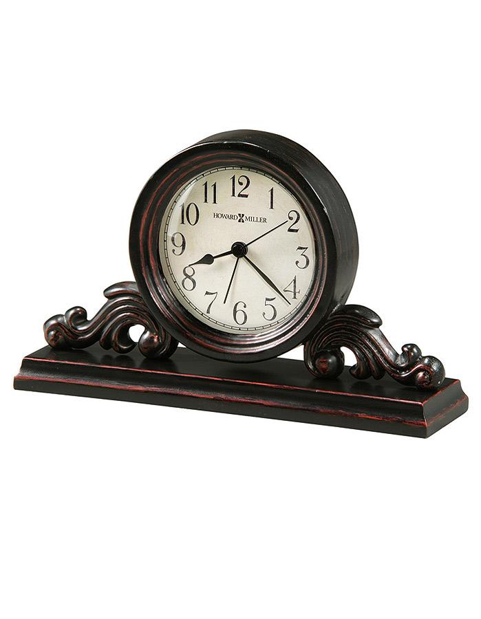 - This decorative metal and wood alarm clock features an aged, off-white dial and has aged black Arabic numerals and black hands beneath a convex glass crystal.