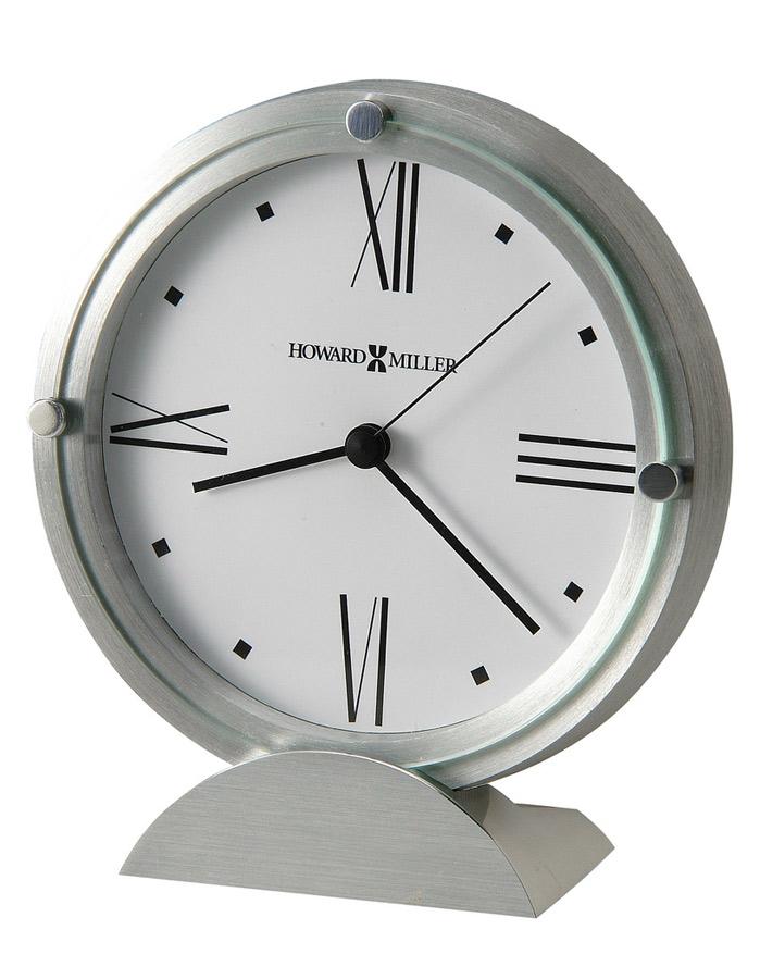 - Brushed aluminum clock features a flat glass crystal accented with 3 polished silver-tone buttons and set in a brushed and polished aluminum semi-circle base.