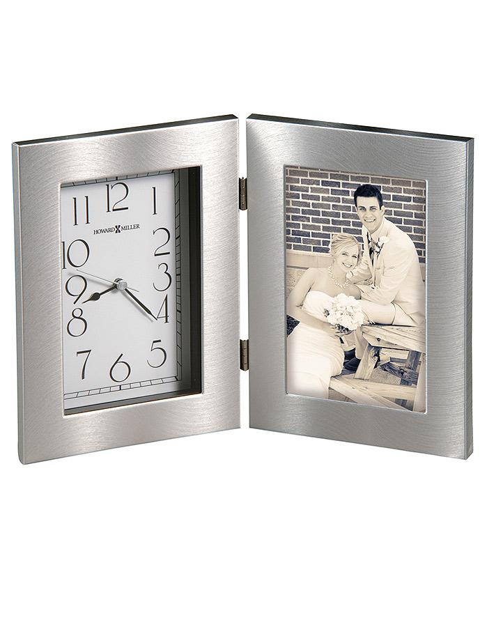 • A frame with swirling brushed silver-finish surrounds the dial and picture window of this hinged, tabletop clock.