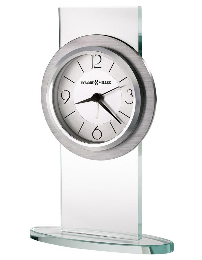 This modern table clock is held up by a single glass panel and features an oval shaped base with a brushed aluminum clock frame with polished accent.