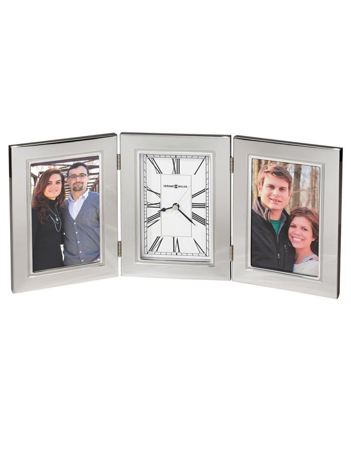 - Contemporary styling and finishes highlight this highly polished silver-finished metal portrait clock which includes two photo frames on hinged panels that can each hold a 4" x 6" photo.