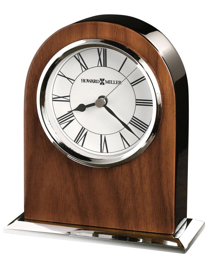 This handsome little clock has a walntu finished front, with contrasting black sides and bright chrome finished base and clock bezel. Teh classic white dial features Roman numeral hour markers and black hour and minute hands.