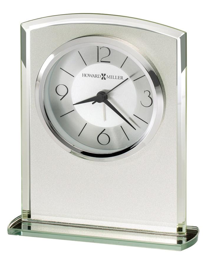 - Striking, frosted glass clock with gently curved top, mirrored beveled edges, and a mirrored glass base.