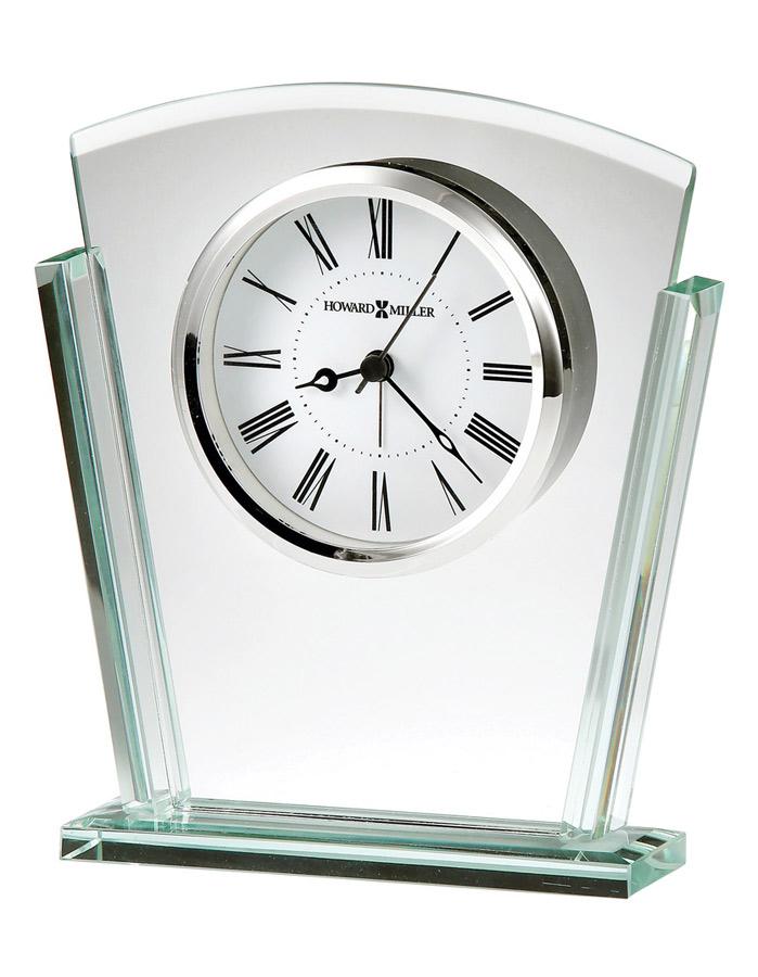 - The contemporary flare design of this jade glass tabletop clock features a curved top, tapered sides, and beveled base, side and center panels.