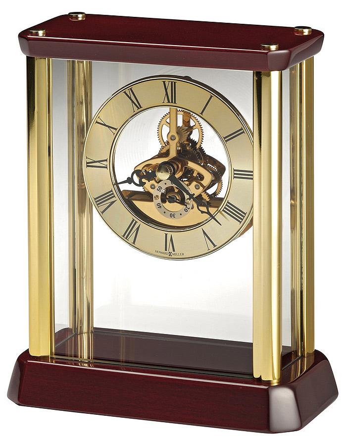 - Stately high-gloss Rosewood Hall finished carriage clock with brass-tone metal corner columns and top caps.
