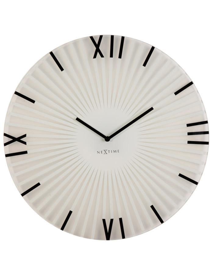 This modern glass wall clock featuers a unique stick design with a white background and black hands and hour markers.