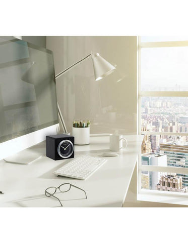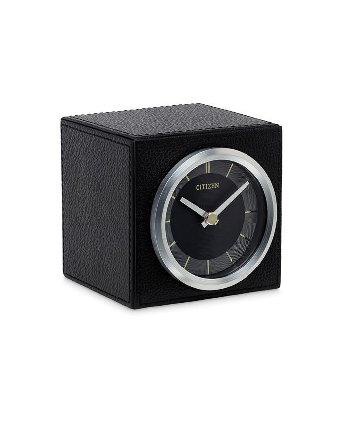 This 3" square Workplace desk clock from Citizen may be small in size, but delivers huge style impact. Premium finishes of black vegan leather and black stitching wrap this item in luxury. To enrich the bold style, a circular black dial clock is accented with metallic tones of silver (hands) and gold (hour markers). Celebrate a recent work anniversary or promotion by customizing the engravable plate.