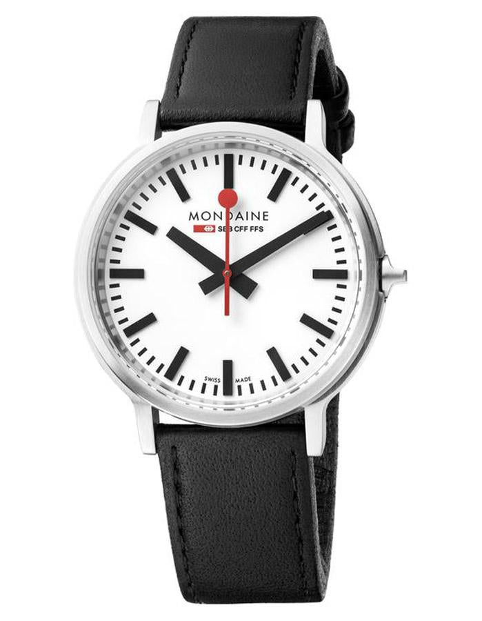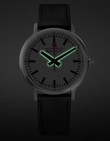 From the Stop2go collection from renowned Swiss watchmakers Mondaine. The Stop2go line features the unique timekeeping of official Swiss railway clocks were time pauses 2 seconds before the minute hand advances. To achieve this iconic timekeeping, two quartz motors are used to control the seconds hands and minute/hour hands separately. The time and motion of the hands are maintained by a "special integrated circuit" to ensure precise timekeeping. The minute and hour hands are backlit with superluminova to provide easy reading in the dark without limiting Mondaine's modern design aesthetic.