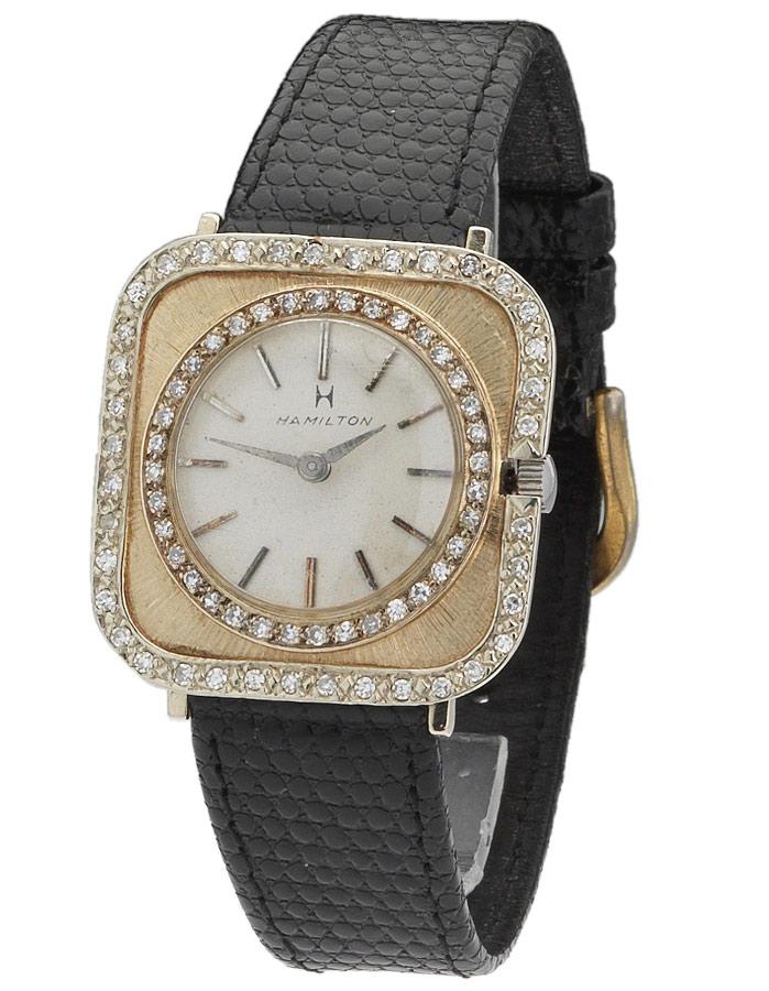 This fine and rare Hamilton 14K yellow gold dress watch (Circa late 1950's) features two sets of genuine diamonds accenting the bezel and inner dial ring, framing a white dial. Originally designed for a man but now perfect for a ladies wrist, this elegant timepiece is powered by Hamilton manual wind movement, and affixed with a new black lizard grain leather band. Original Hamilton box included. Watch is in excellent condition and is keeping good time.