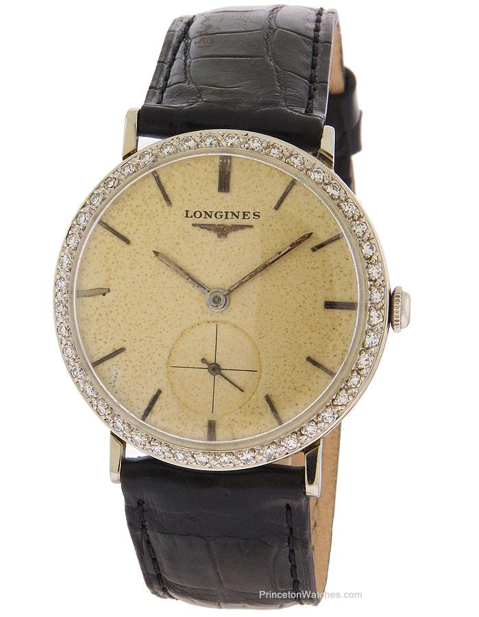 This superb vintage (circa 1960's) men's dress watch will look equally at home with a Tuxedo or a pair of jeans, featuring an 18k white gold case, diamond bezel, sub seconds dial, and a new black leather alligator strap. Wonderful patina on dial and hands.